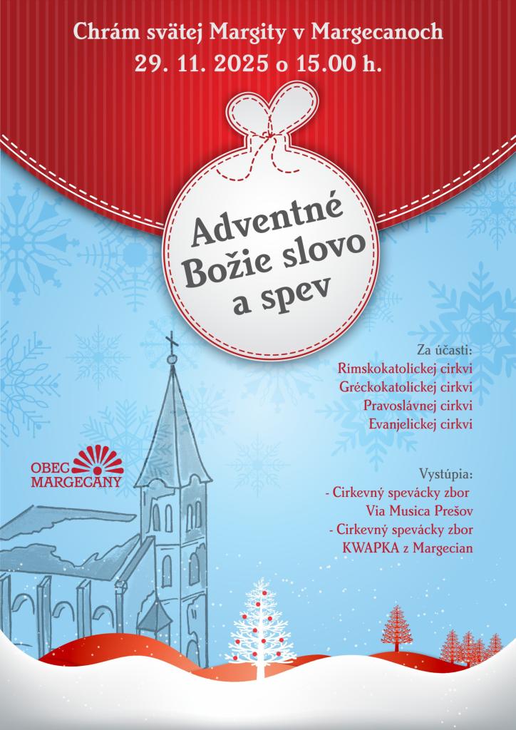 Obec Margecany Vás srdečne pozýva na Adventný večer 29.11.2025 o 15.00 h v kostole v Margecanoch, vystúpi komorný spevácky zbor Via musica z Prešova a cirkevný spevácky zbor Kwapka z Margecian.