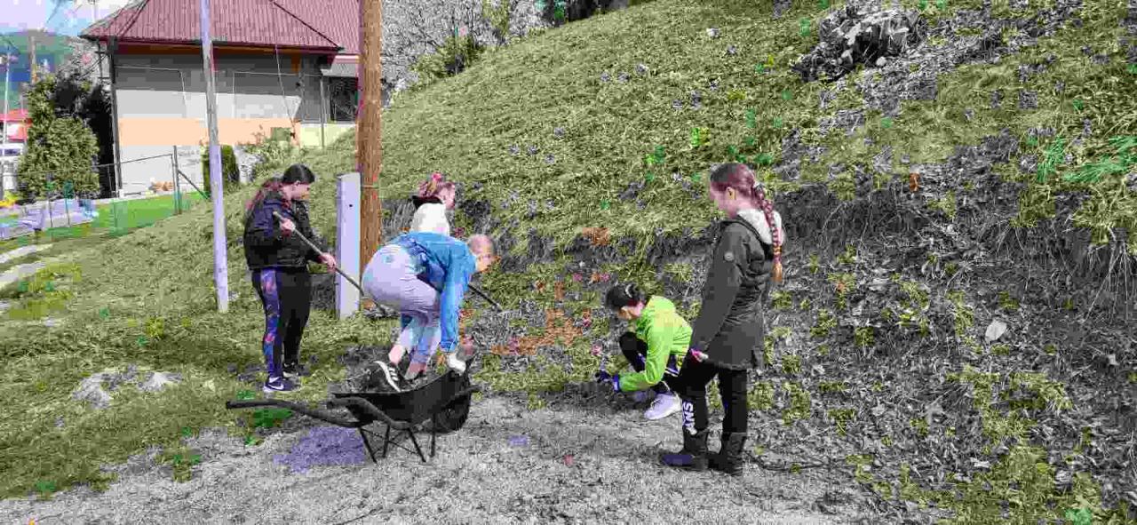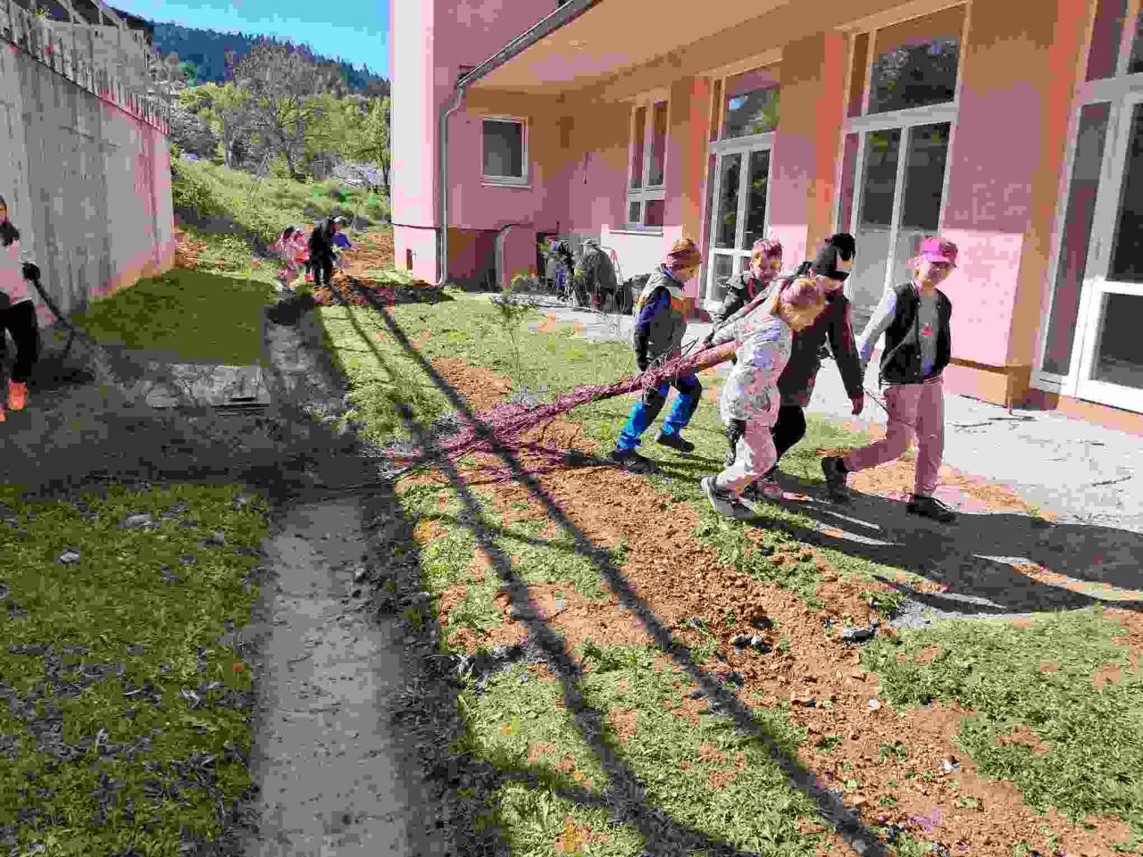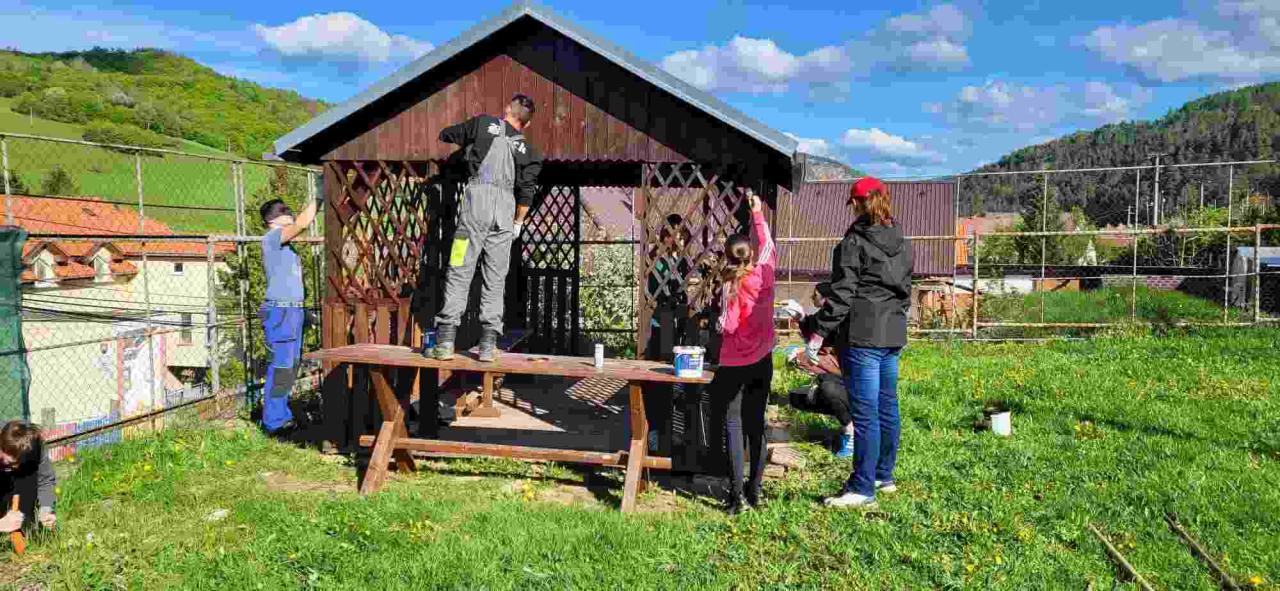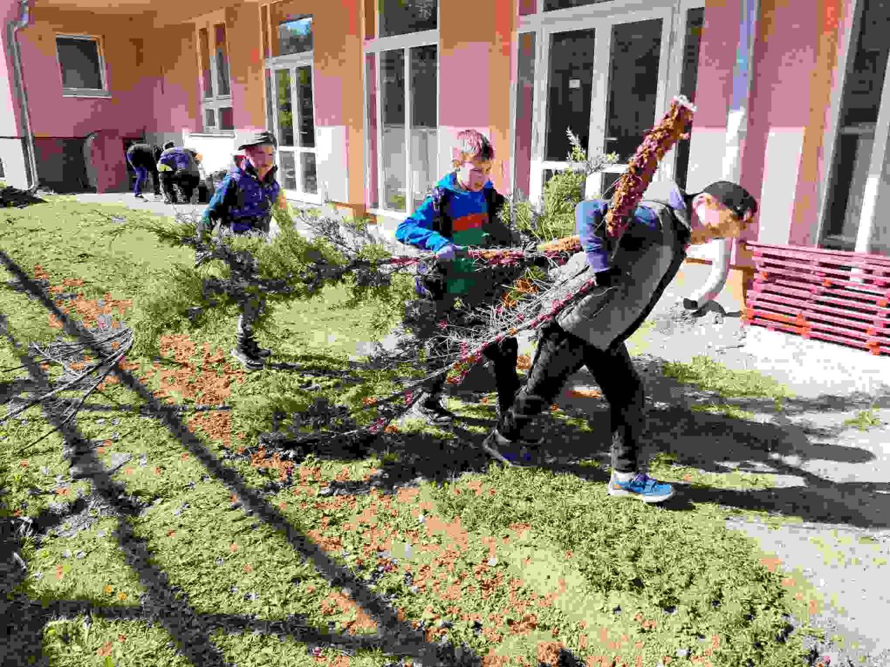 Podarilo sa nám odstrániť náletové dreviny a konáre stromov, ktoré boli následne spracované štiepkovačom na štiepky, ostrihať kríky, pokosiť trávnik a upraviť detské ihrisko, vyčistiť a skrášliť celé okolie školy výsadbou kvetín, namaľovať altánok, upraviť živý plot.