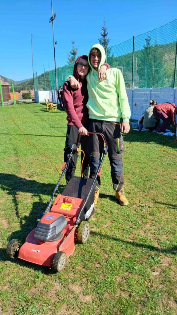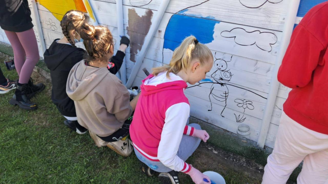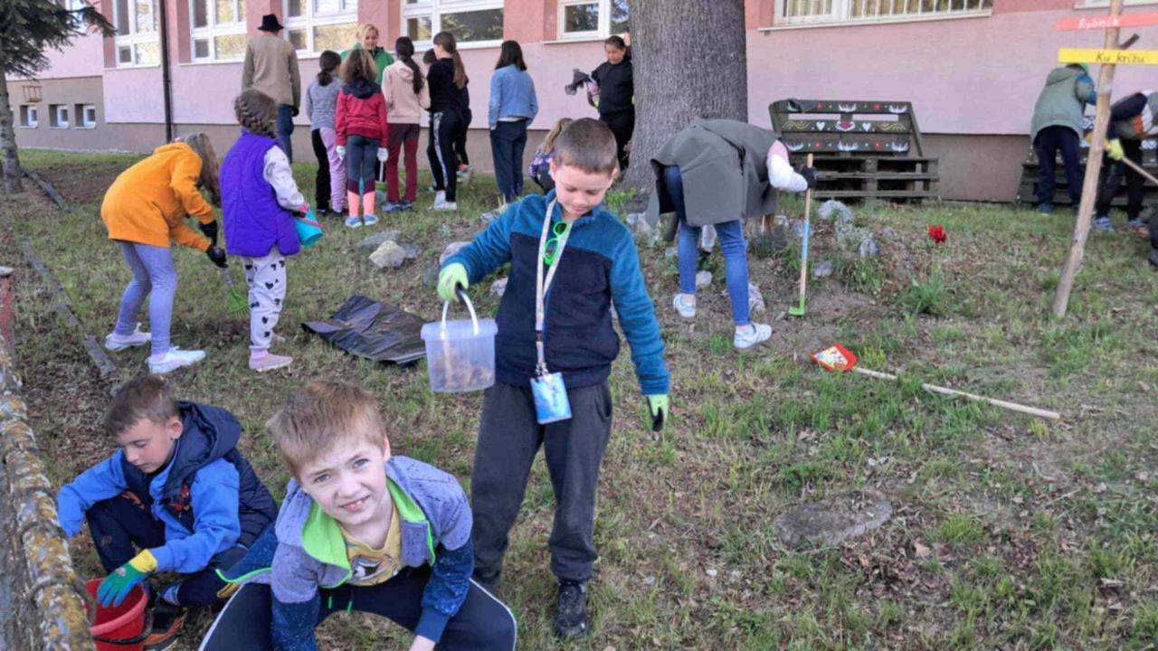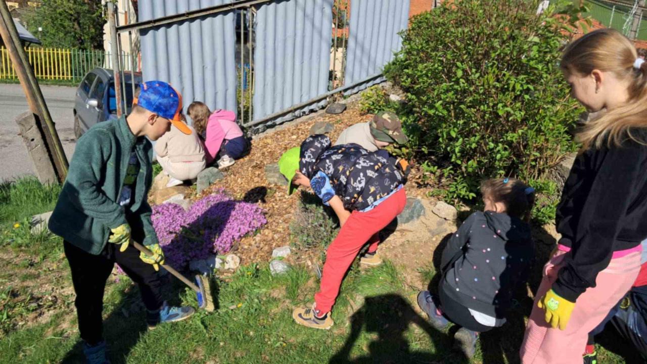 Aj my sme dnešný deň využili naplno. Slniečko nám krásne svietilo a jarné upratovanie okolia školy, oživenie našej skalky a zasadenie jarných kvietkov nám šlo od ruky. Fúrik, lopata, rýľ či hrable nám horeli pod rukami. K tomu všetkému sme pridali štetce aj farby a vytvorili krásne farebné dielo.
